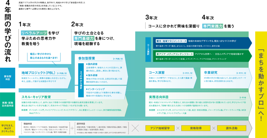 武雄アジア大学の学びの特徴は、各学年で、地域の中で学ぶ「参加型の科目」と 「実践・就職志向型の科目」を用意していることです。基礎から専門へ必要な力を着実に積み上げます。